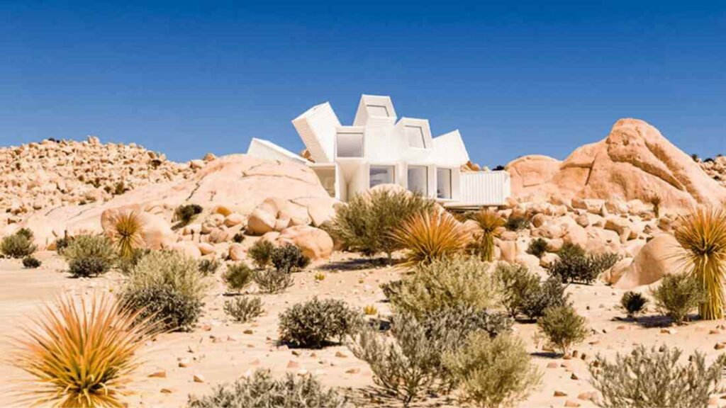 This iconic desert residence redefines container architecture with its explosive, starburst-like arrangement of white-painted containers. Nestled into the rocky mountainside of Joshua Tree National Park, it features panoramic views, solar power, and a minimalist interior that blends seamlessly with the arid landscape.