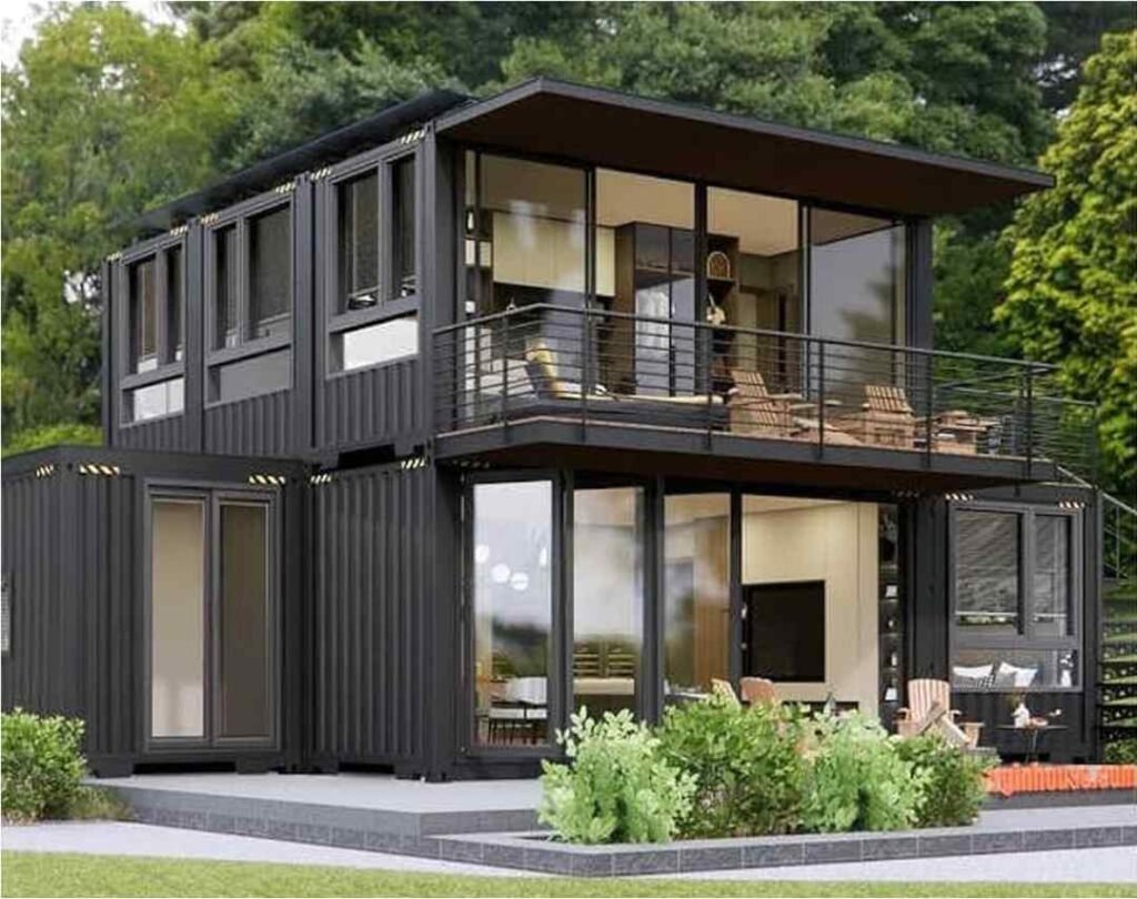 High-end builds using multiple 40-foot containers create sprawling residences with multiple bedrooms, open-plan living, and custom features like wood cladding and floor-to-ceiling windows.