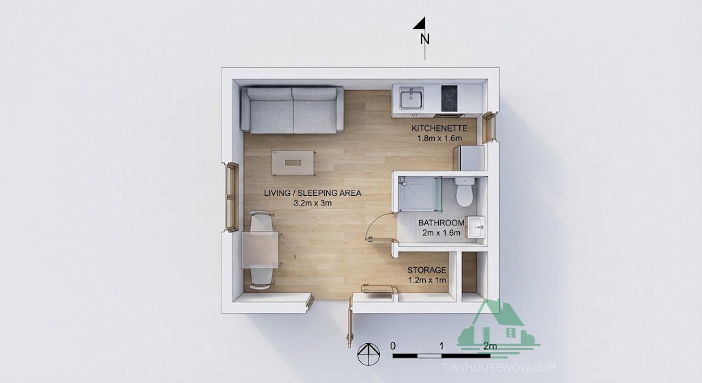 The 2D architectural drawing reveals the strict discipline required for micro-living. There are no wasted corridors or oversized zones. The plan clearly delineates the open-plan “public” space (living and kitchen) from the enclosed “private” space (bathroom and storage).