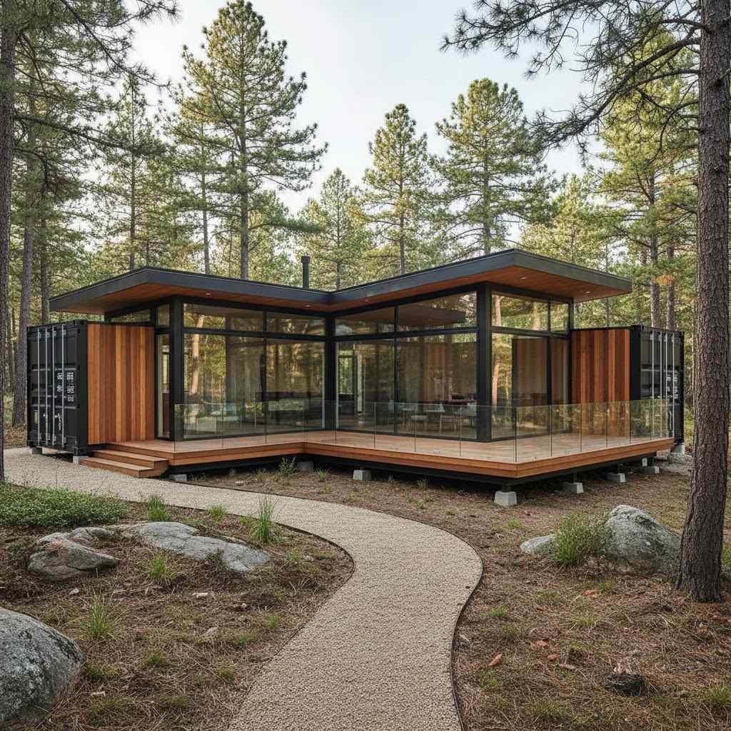 In a clever repurposing of maritime relics, this tiny home reimagines two shipping containers as a unified retreat, angled in a V formation to cradle its inhabitants amid the forest’s embrace. The design intent appears rooted in simplicity and symbiosis, transforming cold, functional steel boxes into a warm, inviting space that prioritizes views and light. By joining the containers at a central pivot, the structure creates an intimate core where living areas likely converge, fostering a sense of openness within a compact footprint.