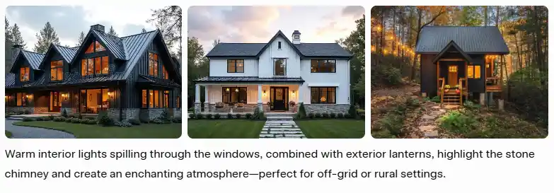 Similar designs often feature evening lighting that turns the home into a glowing sanctuary at dusk.