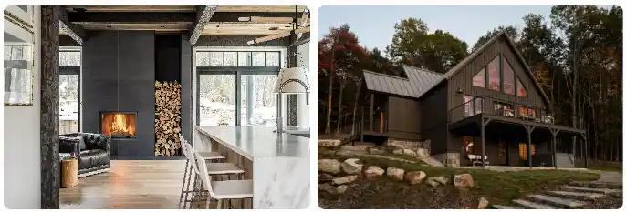 With rising interest in sustainable, minimalist living, dark modern tiny houses like this one appeal to those seeking affordability without compromising on style. The stone chimney suggests wood stove efficiency (potentially off-grid compatible), dark materials reduce maintenance, and the overall design promotes indoor-outdoor harmony.