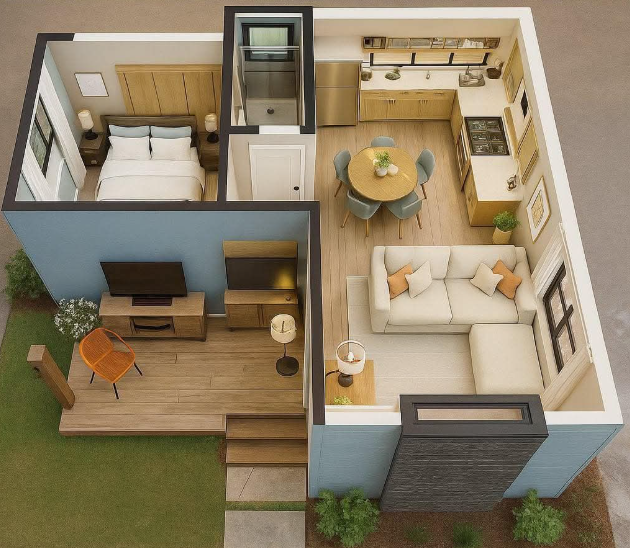 At first glance, this tiny home might seem compact — but step inside (even if just in your imagination), and you’ll realize how brilliantly every corner has been crafted for comfort. The open floor plan connects a cozy living area, a modern kitchen, and a soft-toned bedroom in perfect harmony.